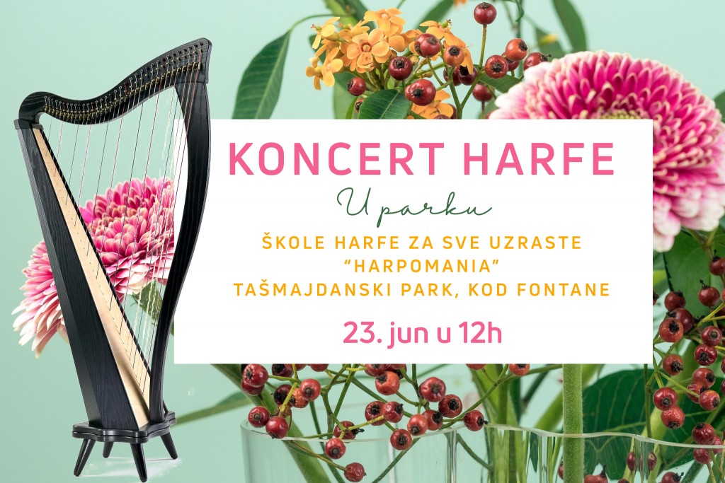 Ove nedelje, 23. juna od 12 časova, održaće se koncert harfe u Tašmajdanskom parku. Polaznicima škole harfe za sve uzraste „Harpomania“ pridružiće se i učenici drugih škola. Takođe, nastupaće i najmlađi polaznici grupnih radionica harfe, koje se sprovode prvi put u Srbiji.