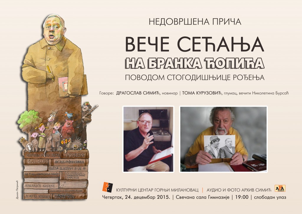 Povodom stogodišnjice od rođenja Branka Ćopića, Kulturni centar Gornji Milanovac organizuje u četvrtak, 24. decembra u Svečanoj sali Gimnazije veče sećanja na ovog sjajnog i popularnog pisca.