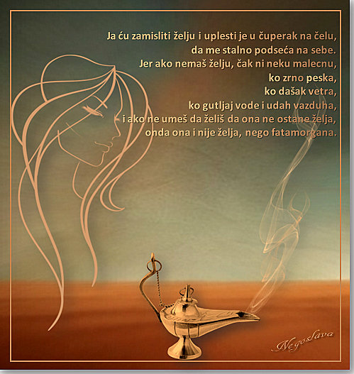 Ali je jednako važno, ako ne i najvažnije, osluškivati sebe. Tražiti svoj put i svoj način. Priznati da si pogresio, kad si pogrešio, shvatiti šta nisi smeo, hteti baš to što si zaista hteo. Očekivati za sebe samo najbolje i raditi da to i dosegneš. Ne gaziti i ne povrediti druge. Ne oteti, ne lagati, ne varati. Ne zavideti. Ne odbiti pružiti pomoć kad vas zamole, ali je i nuditi ako ne kažu da im treba. Ne zato što je neće ceniti, tu netraženu pomoć, već stoga što će možda pomisliti da očekujete nešto zauzvrat. Ili će prestati da vas cene, jer se mešate u njihova posla. Jer vas ništa nisu pitali. Jer ste posumnjali u njihove sposobnosti. Jer ste im pokazali da mislite da ne vrede. Da neće moći sami.