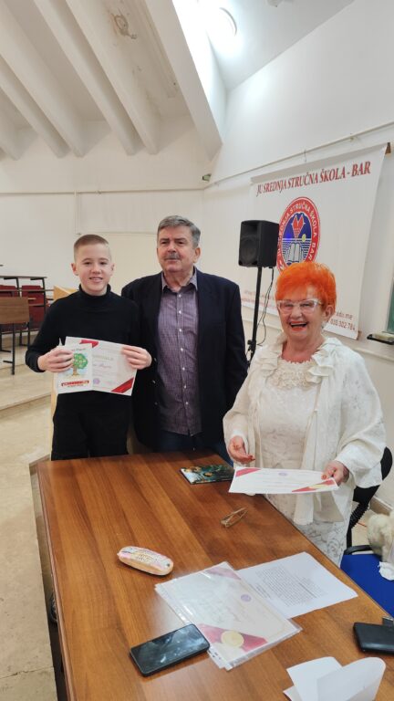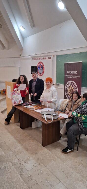 Sarić je potom čitala imena nagrađenih u literarnom dijelu i uručivala diplome, dok je Lončar nagrađenim učenicima uručivao poklone koje je za ovu priliku obezbijedila knjižara „Miral“ – simbolično po jednu vrijednu bilježnicu i olovku, a prvonagrađenoj Mariji Jovanović i ranac, kako bi u njemu nosila bilježnicu na svojim putovanjima iz Bara.