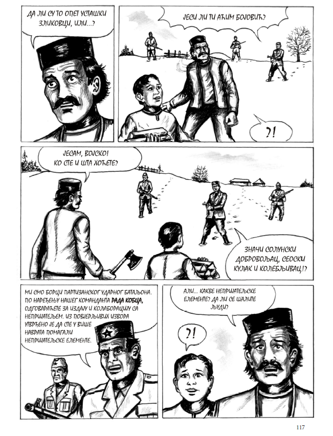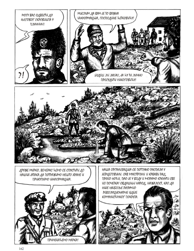 Navešću još jedan primer. Ozloglašeni Ustaša, Mijo Babić Đovani, zaista i jeste poginuo na ovim prostorima 1941. godine, kako tačno prikazuje Bratić u stripu. Međutim, njegov ubica nije bio neki vrli četnički junak. Njega je, zapravo, smrtno ranio izvesni Jovan Rupar, pod komandom Dukice Grahovca; oba čoveka su gajila simpatije prema komunističkom pokretu, te su se iste godine, bilo pre ili posle ustanka, pridružili partizanima. To je faktoid koji je Bratić izostavio iz stripa, i isreno sam pomalo razočaran u to.