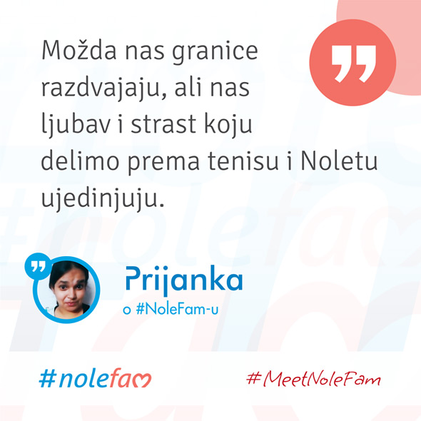 Ovo je najlepša stvar vezano za NoleFam. Njihova podrška je fantastična. Tu su jedni za druge i ujedinjeni su kao prava porodica. Možda nas granice razdvajaju, ali nas ljubav i strast koju delimo prema tenisu i Noletu ujedinjuju.