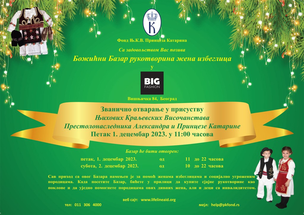 Beograd, 27. novembar 2023. – Njihova Kraljevska Visočanstva Prestolonaslednik Aleksandar i Princeza Katarina svečano će otvoriti tradicionalni dobrotvorni Božićni bazar rukotvorina žena izbeglica u petak, 1. decembra 2023. godine u 11 časova, u tržnom centru Big Fashion, Višnjička 84, Beograd.