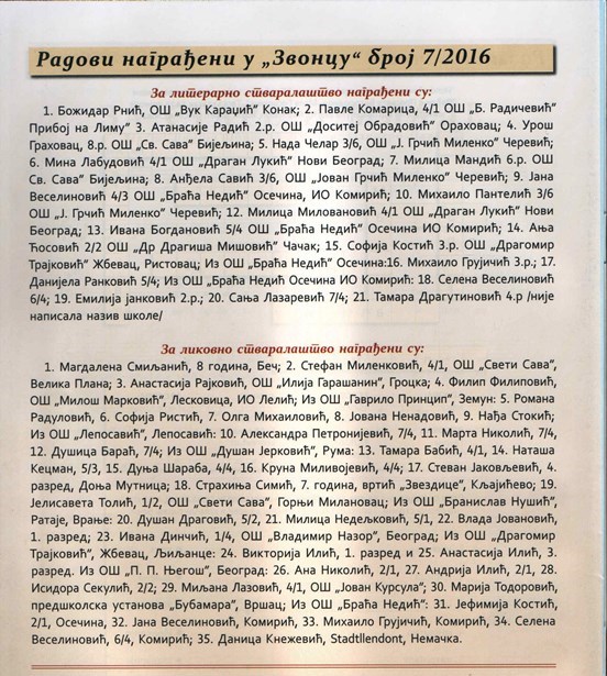A „Svetosavsko zvonce“ pravoslavni dečji časopis u broju 7/2016 nagradio je za literarno stvaralaštvo Uroša Grahovca, VIII razred i Milicu Mandić, VI razred.
