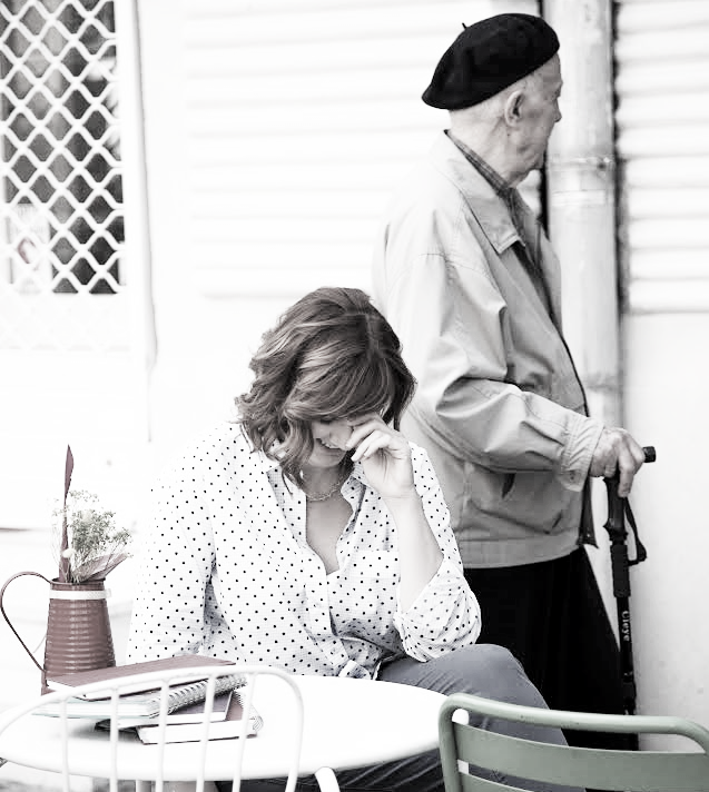 „Baš bi bilo dobro da uz tebe bude neki muškarac“. Taman što je fotograf izgovorio te proročanske reči, iza mene nailazi starac sa štapom… i postaje deo kadra. Dobro, nema veze, daj šta daš… Čime bismo mogli da ulepšamo atmosferu? Za susednim stolom lokalna ekipa nas posmatra podsmešljivo. Pokušavam da dozovem njihovog psa. Nezainteresovano mi prilazi, ne bi on da pozira ako mu ne dam neki gric. Nemam ništa. Pas me napušta. Prilazi nam mlada Romkinja, zagovara fotografa i usput pokušava da mu mazne neki komad opreme.