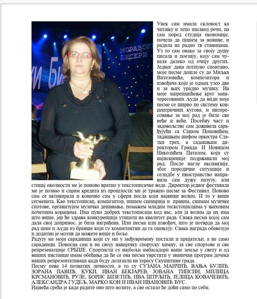 Hvala što ste upućeni u moj rad, ali kada bih ispričala šta je sve propratilo tu pesmu, odmah bismo otvorili rubriku, verovali ili ne. Sve to se nije videlo, a bejaše muke i te kakve zajedno sa spletom okolnosti koji se dešava jednom u million. No, bitan je kraj. Sve se lepo završilo, nagrada je u mojim rukama, i naravno, primila ju je izvodjačica, ja dok sam stigla do pozornice. Prošao voz….Ha, ha… Da nije takvih dešavanja, ne bih sad bila bogata za uspomene i još jednu borbu za koju mogu da kažem pobedila sam!