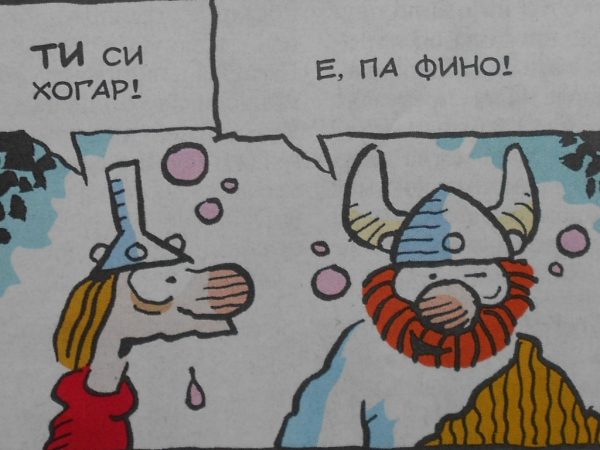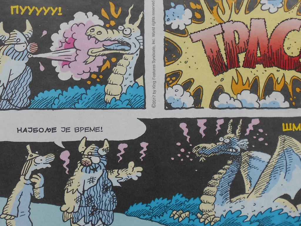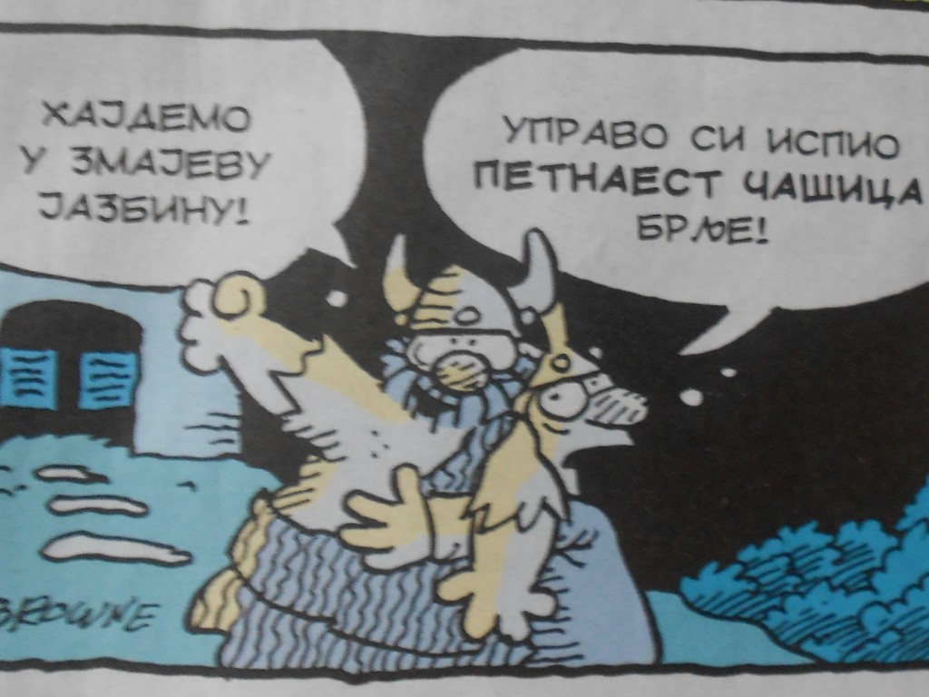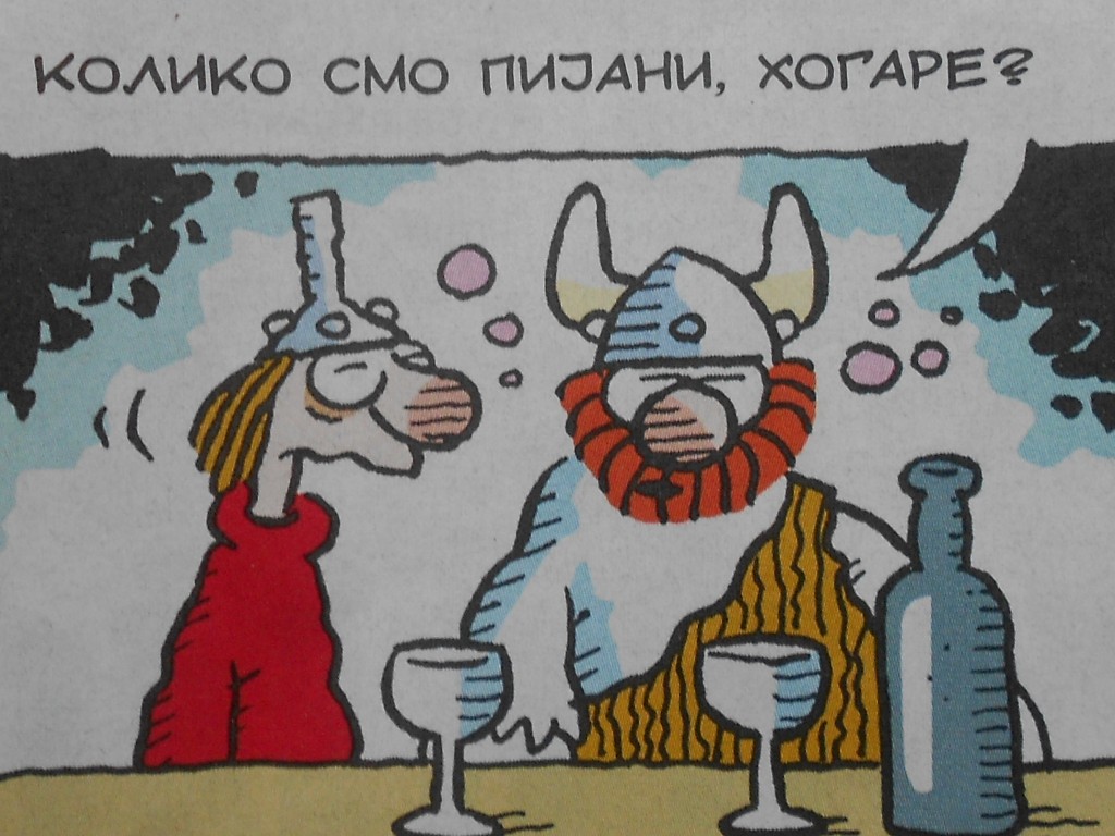 Od onih, tako davnih a tako svevremenskih zgoda, još uvek rado posežemo za dogodovštinama Hogara Strašnog, tog simpatičnog varvarina, često nemarnog tipa, ali odlučnog ratnika i uz to obzirnog, pa i bojažljivog porodičnog čoveka… Prilažemo još jedan kratež koji prikazuje koliko može da bude silan, hm, nakon odgovarajućeg vatrenog punjenja… Uz veliku zahvalnost Politikinom zabavniku (nekada i Stripoteci) o ovom junaku rado iščekujemo nove zgode i nezgode u formi kratkog novinskog stripa, koje nas često podsećaju na našu savremenu svakodnevnicu ma na koliko davne događaje se odnosile! (Davne… Stvarno, videste li u skorije nekog zmaja, mislim baš neprikrivenog reptila – zmaja, da se u ova naša vremena vrzma negde ovuda? )