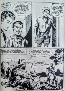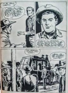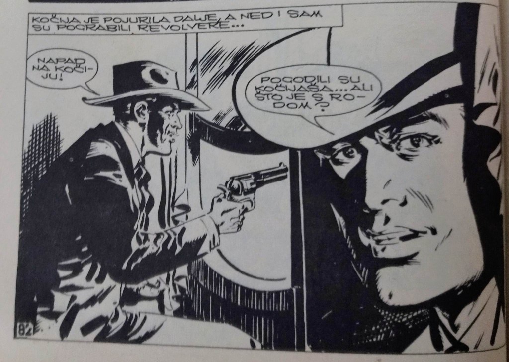 – Porodice Lou i Tomson napokon mogu da se druže kao što i priliči dobrim susedima, a implicitno se ističe, odn. možemo se podsetiti, da je među Tomsonovima jedna lepa i otresita devojka, a u porodici Lou ima neženjenih momaka, pa… Samo kažem! ;-) – U oba ova stripa, kao što i priliči vestern crtanijama, mislim da je izražen znatan stepen grafičkog realizma (koji je i potreban pri svim tim dinamičnim pokretima, na primer), naročito u priči koju smo danas predstavili, jer se ističe malo tananijom linijom crteža, a samim tim i nešto boljim senčenjem… – Kada malo obratimo pažnju, uviđamo da nema previše udaljavanja u prostoru koje obično sledi avanturističkom žanru (pa i ovom podžanru – tu su grad i bliža okolina, bez širenja teme na (nove) seobe, istraživanja, duge potere i traganja…) a složićemo se da je ovde naglasak na internom sukobu naseljenika, u koje spadaju i stabilizovani rančeri, odmetnici i pustolovi, i drugi ljudi oko njih, ali bez ikakvog uticaja starosedelaca (Indijanaca) pa u pravom smislu možemo nastojati da uživato u par vrsnih „kaubojaca“, kako bi neki uprošćeno rekli.