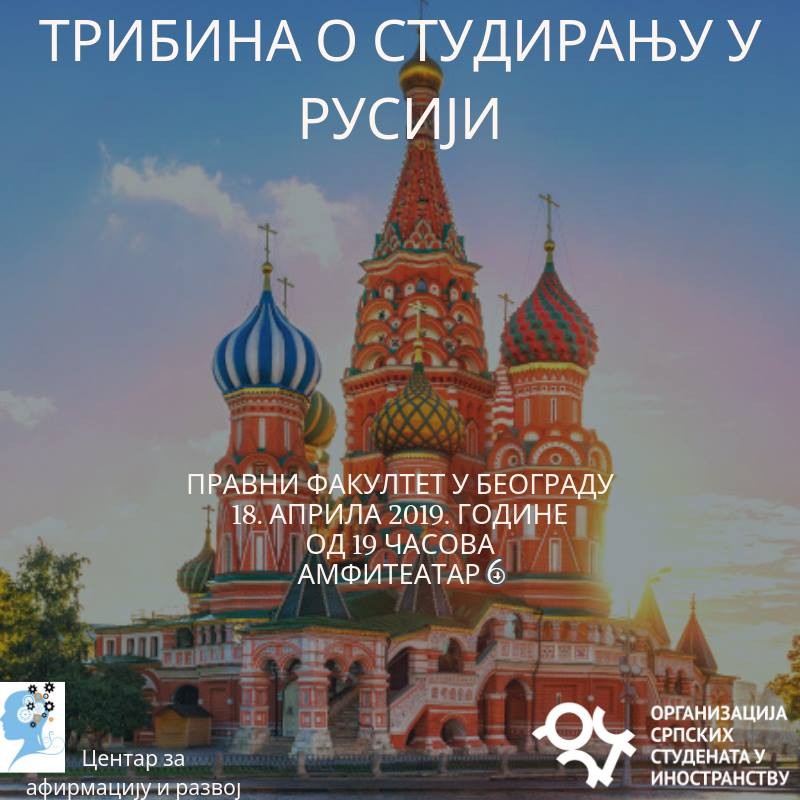 Pozivamo vas da prisustvujete informativnoj tribini o studiranju u Rusiji koja će se održati 18. aprila 2019. godine sa početkom u 19 časova na Pravnom fakultetu Univerziteta u Beogradu (amfiteatar 6) u saradnji OSSI – Organizacija srpskih studenata u inostranstvu i Centar za afirmaciju i razvoj.