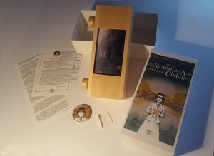 U kutiji je bilo svakoječega. Prvo tri papira – na jednom kratki uvodnik, na drugom uvodnik od Bogičića i tekst od Baćkovića, na trećem jebene instrukcije za čitanje. Uz to, jedan sitni papirić u kome su ekseri ukoliko želite da strip zakačite na zid (?!?!), kao i jedan bedž sa slatkom Sofijom na njemu. Resto kutije zauzima sam strip, takođe kutija, ali ovaj put od drveta i stakla, sa sve numeracijom (moj je primerak 77 od 100). Rotiranjem drvenih kotura, krenuo sam u putešestvije zvano „Od Hadrijana do ponizne Sofije“, u tzv. fikciju omeđenu istinom (ili prostim rećima, fikcijom).