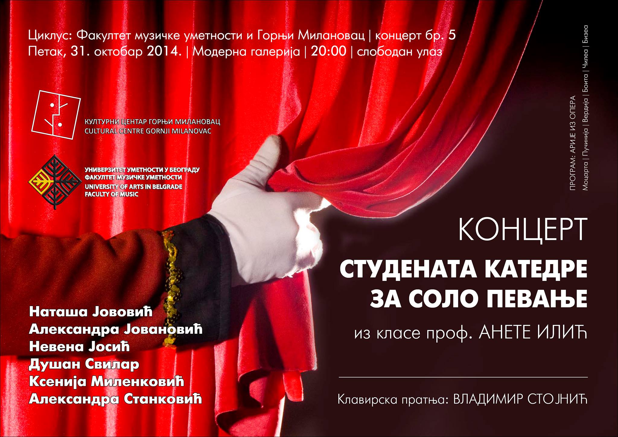 Studenti katedre za solo pevanje Fakulteta muzičke umetnosti u Beogradu iz klase Anete Ilić, u petak, 31. oktobra održaće koncert u Modernoj galeriji. Arije iz Mocartovih, Pučinijevih, Verdijevih, Boitovih, Čileovih i Bizeovih opera pevaće: Nataša Jovović, Aleksandra Jovanović, Nevena Josić, Dušan Svilar i Ksenija Milenković.