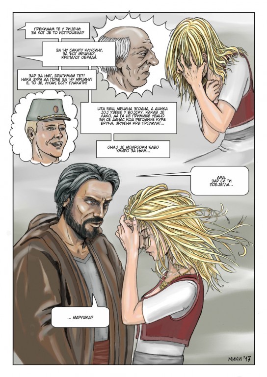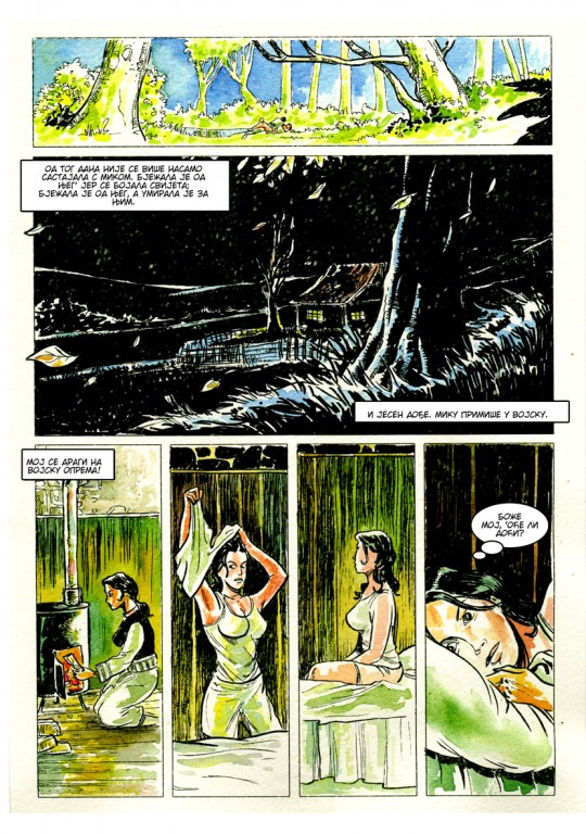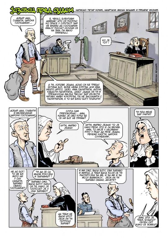 No, natrag na Kočića. U sklopu albuma „Stripovijetke“ su pet strip-priča, adaptacije pet najprepoznatljivijih dela ovog spisatelja. Od dotičnih sam lično bio upoznat samo sa dva. „Jazavca“ sam znao iako ga nisam čitao, a „Jablan“ nam je krasio čitanke pozne osnovne škole, a nije ni velika priča pa se čitala ko od šale. Ostale priče adaptirane u ovom albumu su „Kroz maglu“, „Mrguda“ i „Grob slatke duše“. Izdanje koje ja posedujem ima šezdeset tabli stripa (i još šezdeset na drugom jeziku) i od toga su samo dva stripa – „Jablan“ i „Kroz maglu“ u boji. Milan Mladić je kao kompletan autor adaptirao te uvodne priče u boji, dok je Predrag Ikonić (za nas prijatelje i saborce po stripu Peđa Slavni) potpuni autor „Mrgude“ i „Groba slatke duše“. Oba autora su na ravne časti podelili crtež najzahtevnije adaptacije, „Jazavca“…