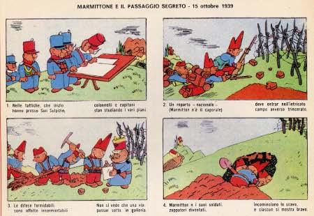 Ovdašnji fašizam nije toliko represivno delovao na strip produkciju – svakako je bilo tendencija da se ovaj medij iskoristi u svrhu ideološke propagande, a na drugoj strani je bio npr. „Marmittone“ (od 1929. do 1940.) od Bruna Angolete .) –sa blago antimilitarističkim izrazom (uporedite ga idejno-estetski sa vojnikom Švejkom!), i to je bio neki maksimum liberalizma i tolerancije koji u to vreme strip mogao sebi da pruži. Inače, 1939. je do daljnjeg bilo zabranjeno izdavanje inostranih stripova, pa su mnogi junaci kao „zamaskirani“ i prilagodjeni našli svoj pandan u vidu domaćih heroja, a jedan od privilegovanih uvoznih likova je ostao Miki Maus (ovde i dan-danas poznat kao Topolino – „mišić“! Još od 1932. izlazi i časopis sa ovim imenom.), što neki tumače ranijom Dučeovom naklonošću prema jednom ovakvom liku!