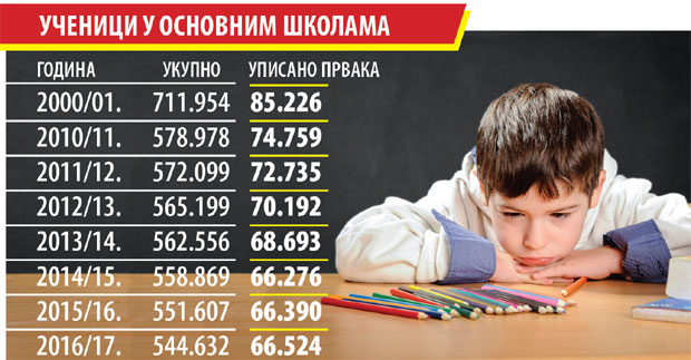 Prema podacima Zavoda za statistiku, školske 2000/2001. godine od prvog do osmog razreda u Srbiji bilo je 711.954 učenika, u školskoj 2010/2011. bilo ih je 578.978, dok su prošlu školsku godinu upisala 544.632 učenika. Pre šest godina, prvaka je bilo 74.759, a prošle godine bilo ih je svega 66.524. Dramatična demografska slika, dakle, najočiglednije se vidi u praznim školskim klupama.