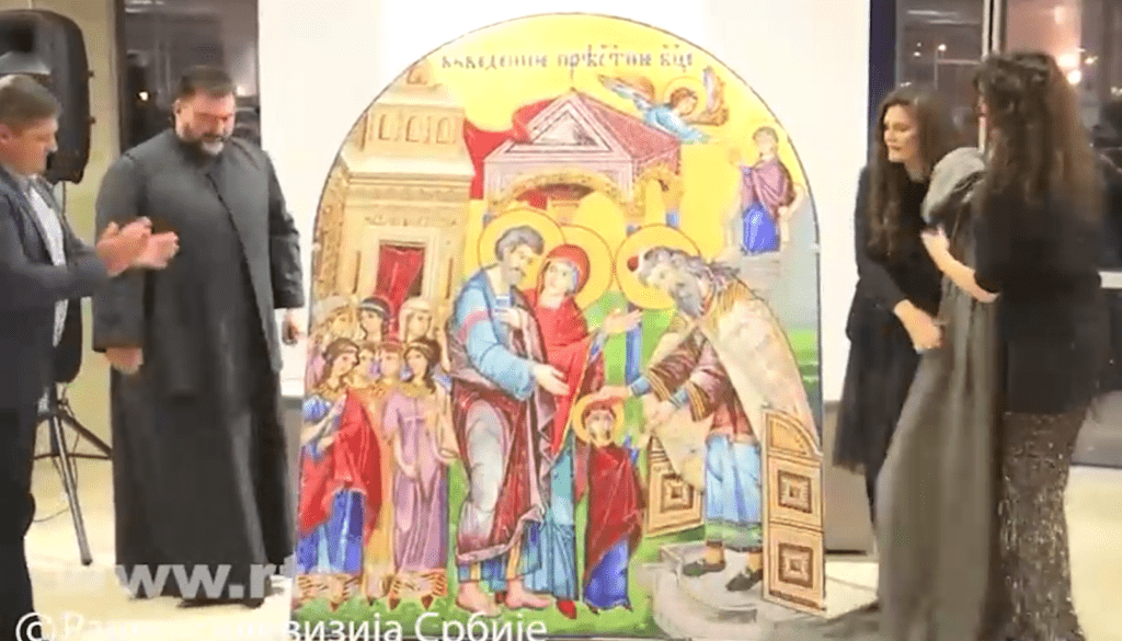 Na mozaiku koji će ukrašavati ulaz u Hilandar je scena Vavedenja presvete Bogorodice. Više od milion prirodnih kamenčića, stakla i paste u mozaik su skoro četiri godine slagale ruke umetničke porodice Ivanović.