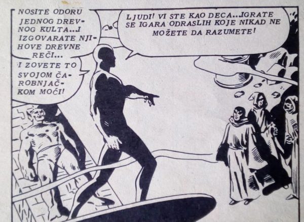 izdanak planete Zen-La, rođen kao Norin Rad, specifično se vezuje za planetu Zemlju – govori sa kivnjom, ali i s pravom, o pohlepi, zlobi, nerazumnosti i drugim nesavršenostima ljudskog roda (gle, zar mora neko iz ko zna kog svemira da se pojavi u funkciji naše savesti!?) ali ipak nastoji da pomogne i saosećajno stane uz rod naše planete kada se pojavi neka veća opasnost, pa se tako on, ionako iz raznih razloga, suočava sa svakojakim zemaljskim i vasionskim silama. Ovo čedo tandema Sten Ji i Džek Kirbi pojavilo se 1966. u kontekstu avantura koje su inače bile rezervisane za Fantastičnu četvorku kao vedete… Sve te Marvelove zvezde se neobično i moćno kreću, i pre ili kasnije se međusobno sreću… Ako smo vam pobudili neki, makar kao zreloprolećni, osećaj i izazov nesputanog kretanja preko negagledivih prostranstava, lepršanja i surfovanja preko galaksija, ostanite uz nas, pa ćemo tokom narednih nedelja i meseci dočarati još neke likove i pojmove iz moćnog sveta Marvel Comics-a!