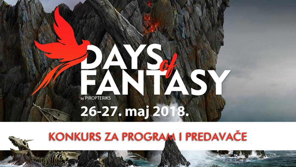 Udruženje „Piropteriks“ vas i ovog proleća poziva da učestvujete na Danima fantazije, najvećem festivalu epske i naučne fantastike u Vojvodini, koji će se održati u Kongresnom centru „Master“ Novosadskog sajma, 26. i 27. maja 2018. godine.