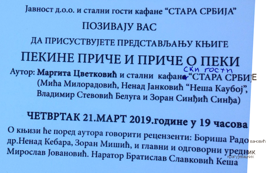 mar 20, 2019 Predstavljanje knjige „Pekine priče i priče o Peki“ ključne rečiPredstavljanje knjige "Pekine priče i priče o Peki"ПЕКИНЕ ПРИЧЕ FacebookTwitterEmailViberReddItWhatsAppTelegramPrintPinterestTumblrLinkedinMixVKDiggLINENaver Facebook Prethodni tekstNa kakav bućkuriš pomislite kada čujete reč papazjanija: Šta je i kako se pravi ovo starinsko jelo?Sledeći tekstAtelje Keti Radevske Miloš IgnjatovićPriređivač Šumadijskog ateljea. Fotoreporter ,,Blica'', ,,LID-'a'', ,,Sportskog žurnala'', ,,Svetlosti'', ,,KG novina'', ,,Politike''. PROČITAJTE! Knjige Lončar među najboljim pjesnicima planete: Objavljeni rezultati za 2025. Zoran Todorović - dec 13, 2025 Knjige Ljubav, stihovi i prijateljstvo u „Itaka Library Bar“-u Zoran Todorović - dec 5, 2025 Knjige Petar Pismestrović: Partija pokera – knjiga karikatura Petar Pismestrović - dec 4, 2025 Otvorena vrata Likovni rad dana: Jesenje drvo Jovanka Ignjatović - jul 30, 2017 Priključenija EXIT i NIS nastavljaju konkurs „Youth Heroes“ Zoran Todorović - dec 19, 2017 Magazin Lidija Jelisavčić Ćirić: Dobrodošli u zlatno doba paranoje Lidija Ćirić - jan 13, 2017 Otvorena vrata Likovni rad dana: Mrtva priroda Jovanka Ignjatović - sep 11, 2015 Atelje Atelje: Reprodukcija, ulje na platnu po V. Volegov-u Dragana Simić - nov 10, 2016 Otvorena vrata Petnica: Pristigla 35. generacija polaznika Zoran Todorović - feb 1, 2017 Zanimljivosti Misao dana Prvoslavka Marković - okt 25, 2017 Priključenija Novak siguran protiv Molčana Zoran Todorović - maj 25, 2022 Mesečina Milan Nikolić Izano: Vreme je u tebi Milan Nikolić Izano - avg 21, 2016 Zanimljivosti Da li ste znali: Ljuta paprika Marija Pašalić - okt 11, 2015 Otvorena vrata Majke i očevi koji zloupotrebljavaju prava ili grubo zanemaruju svoje dužnosti mogu biti potpuno lišeni roditeljskog prava Zoran Todorović - jul 3, 2017 Zanimljivosti Optička varka 4 Prvoslavka Marković - mar 2, 2015