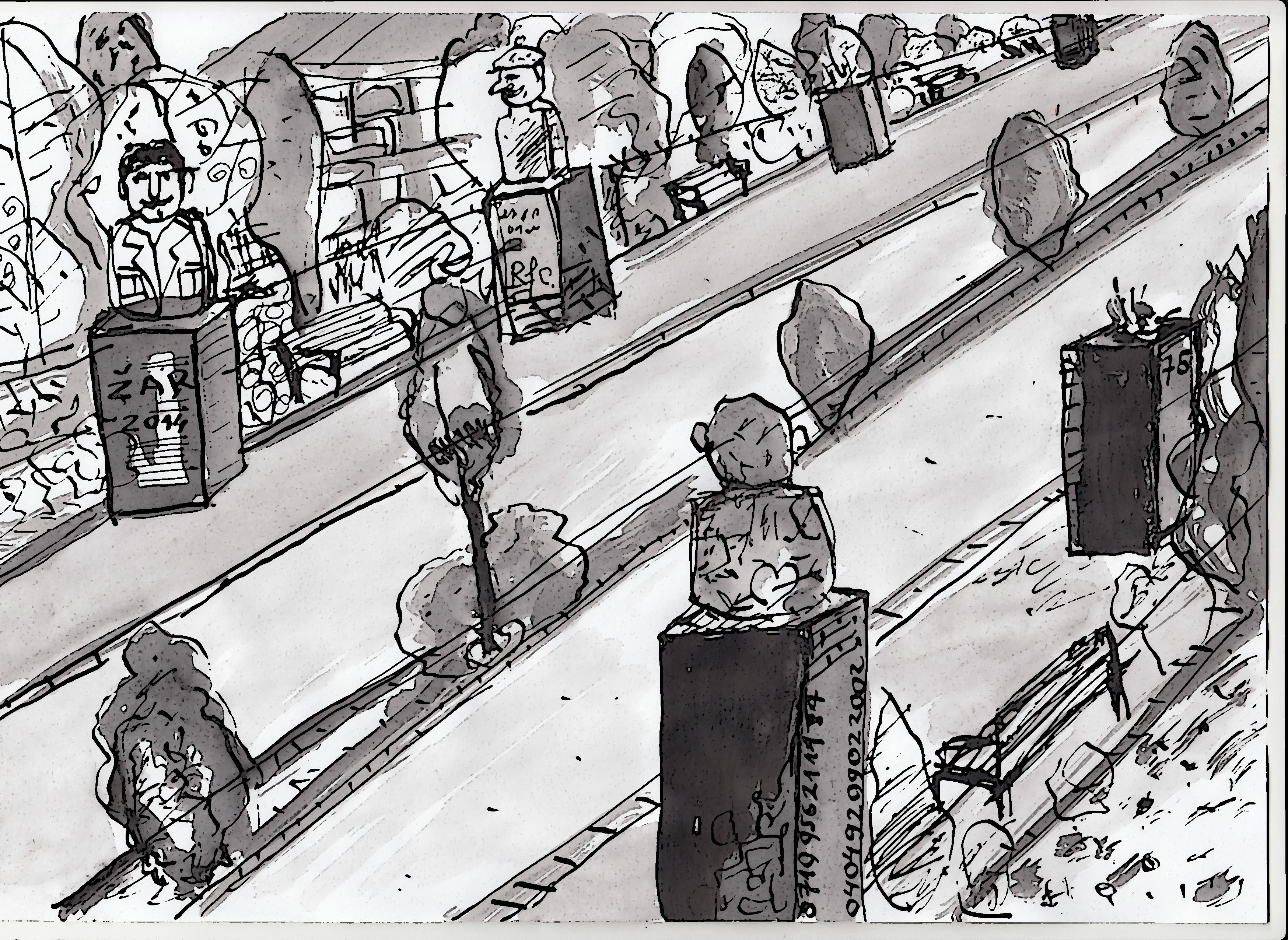 malo dalje, kraj fontane, u kojoj bronzani ranjeni partizan pije vodu dok ga čuvaju bronzani lavići, sede neki zadrigli i masni tipovi. oko fontane je cveće a u cveću prazne pivske flaše. masni se nalivaju pivom gromoglasno kesare i podriguju. jedan uporno svojoj ogromnoj crnoj džukeli gura glavu u vodu. ovde je izgleda jedino psu neprijatno. masni se silno zabavljaju. jedan smrdljivko pokušava pljuvačkom da dobaci do lava na drugoj strani fontane. uneo se u svoj posao, zajapurio. lice mu je isprskano pljuvačkom. čak ga i pas posmatra pomalo gadljivo. smrda ne uspeva da se plasira i mora da ide da kupi pivo. iza njih sedi mladi tata i čita novine. njegov veseli sinčić sistematski gazi cveće oko fontane. tata ne reaguje. povremeno baci blažen pogled na svog vragolana i okrene list. oko mališana koji vežbaju prve korake proleću sumanuti motoristi, turiraju, špartaju okolo kao po pisti. vozikaju i po travi, kuda oni hoće. pitanje je samo kada će početi po deci.