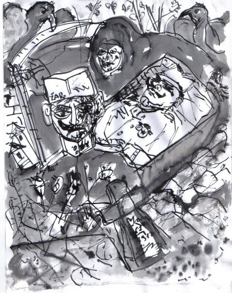 Vreli kamen na vrelom kamenu. Tu samo zmija zube oštri. Suva trava posečica, trnje u borama u očima… Ne smem da te pogledam Bato. Ne smem. Oprosti mi, pogled ti je smrtonosan. Uselila se u njega lepa devojka čobanica sa zelenih naših polja šumadinski i peva neku tužnu pesmu od koje tice padaju mrtve ko žir u jesen. Nije to lepa čobanica Bato nego strašna baba sa kosom u ruci i na belom konju.