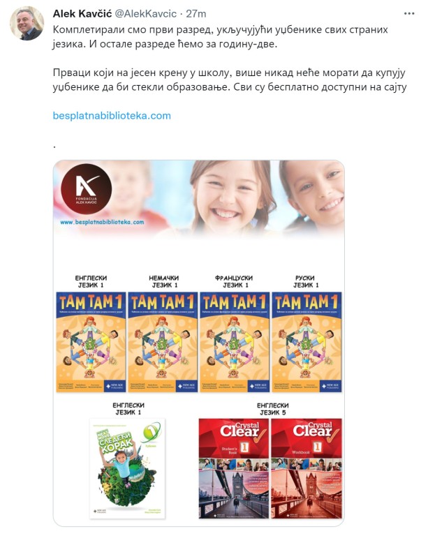 Kompletirali smo prvi razred, uključujući udžbenike svih stranih jezika. I ostale razrede ćemo za godinu-dve.