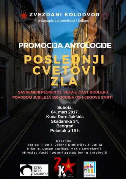 Savremeni pesnici 21. veka u čast Bodleru – povodom obeležavanja jubileja 150 godina od smrti Šarla Bodlera. U organizaciji časopisa za umetnost i kulturu Zvezdani kolodvor u Kući Đure Jakšića, u subotu, 4. marta 2017. godine sa početkom u 19 h, održaće se promocija antologije „Poslednji cvetovi zla“. Učestvuju članovi redakcije časopisa, gosti i autori. Pozivamo sve autore zastupljene u antologiji, prijatelje i saradnike časopisa da svojim prisustvom uveličaju promociju.