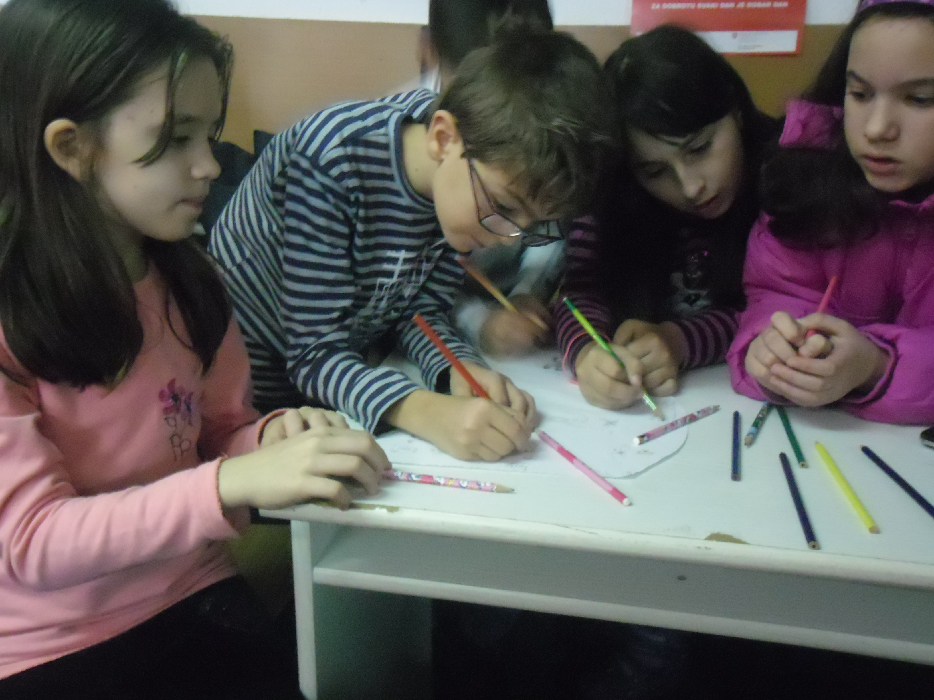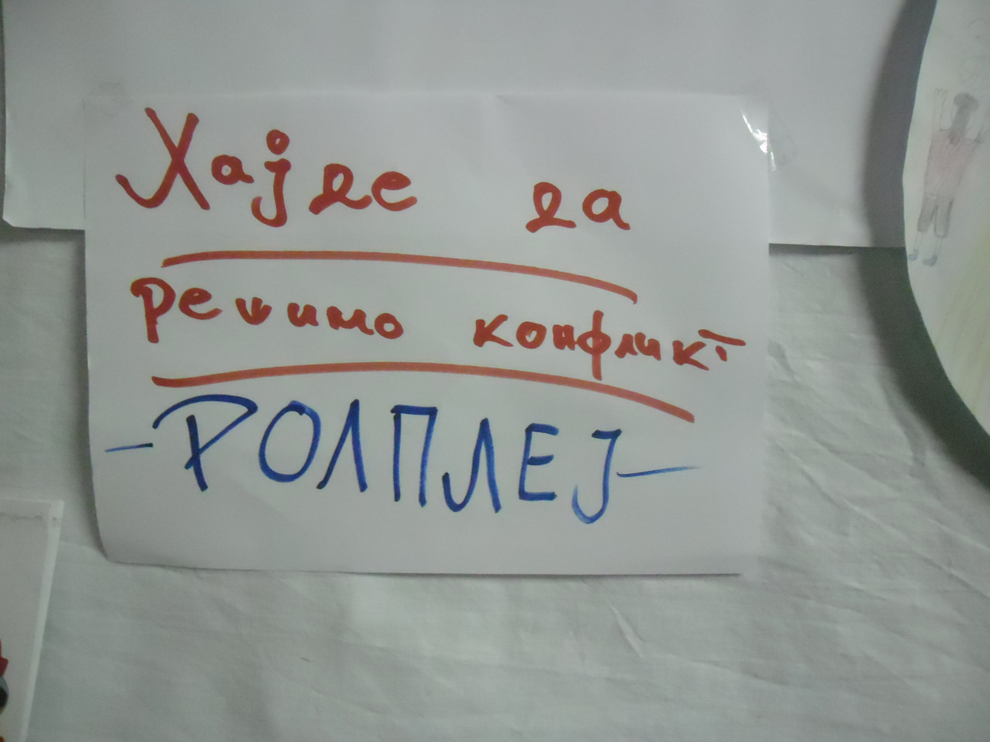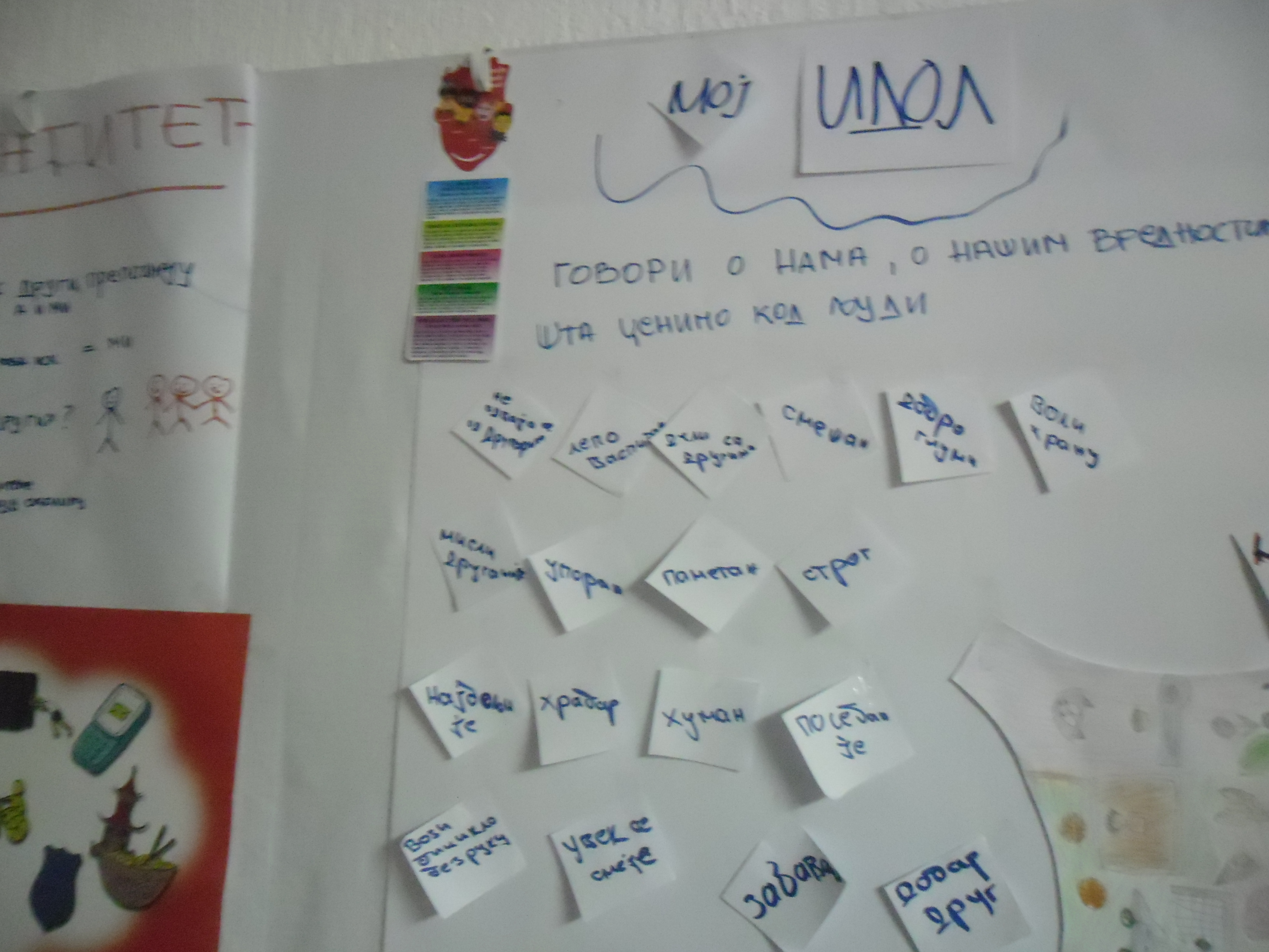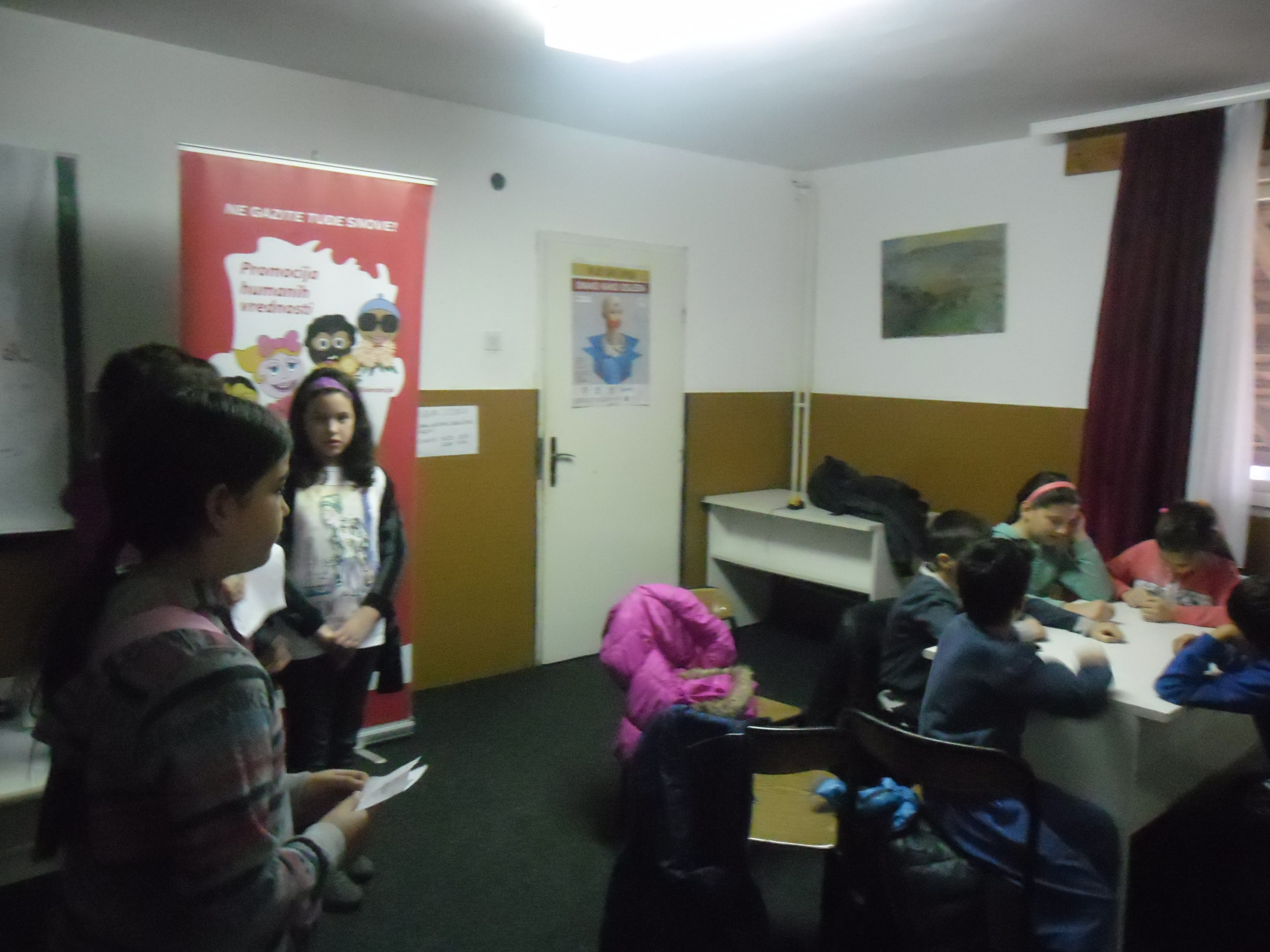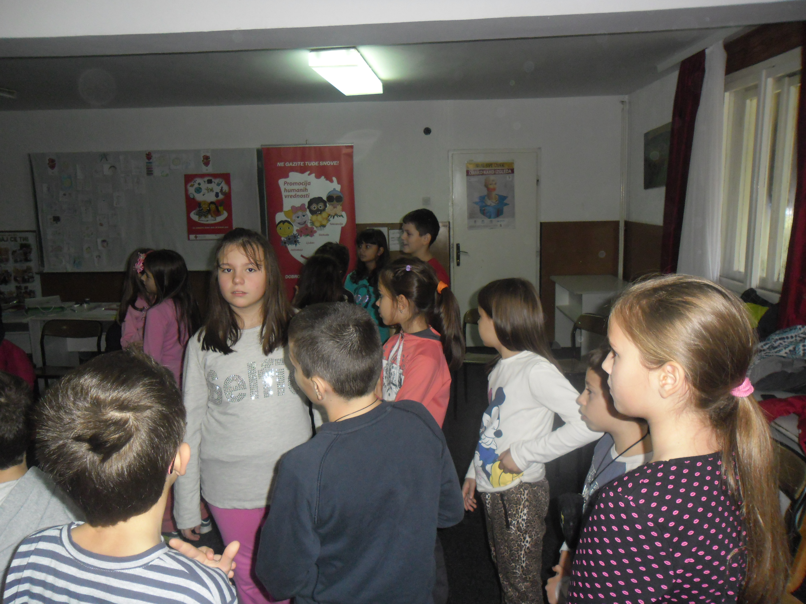 Današnja radionica je počela pod nazivom „Predstavi sebe“ i „Od igračke do plačke“ u kome je bio cilj osvešćivanje prava na privatnost, pravljenje razlika između onog što želimo i ne želimo o sebi da kažemo drugima i usvajanje stava da je „lični prostor“ potreba svakog pojedinca, da ga treba poštovati i dobiti dozvolu da se u „njega uđe“. Treća radionica je bila „U svetu postoji jedno arstvo“ u kome je cilj razvijanje svesti o potrebi poznavanja i poštovanja drugih kultura, razumevanje načina nastanka osobenosti određene kulture. Na kraju aktivnosti, radom po grupama, učenii su napravili Grb humanih vrednosti u kome su predstavili sve ono što je za njih bitno: boje, muzika, sport, snove…….