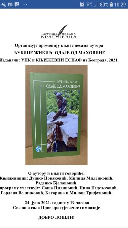 Udruženje pisaca Kragujevca organizuje promociju knjige pesama autora LJUBICE ŽIKIĆ: ODAJE OD MAHOVINE.