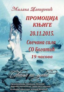 U organizaciji SO Bogatić, Narodne biblioteke „Janko Veselinović“i Kulturno obrazovnog centra, 20. 11.2o15. godine, sa početkom u 19 sati, održaće se promocija knjige „Sećanja na ljubav“ pesnikinje Milane Davidović – članice Udruženja balkanskih umetnika. Promocija će se održati u Svečanoj Sali SO Bogatić.