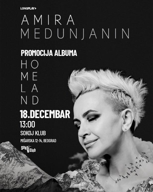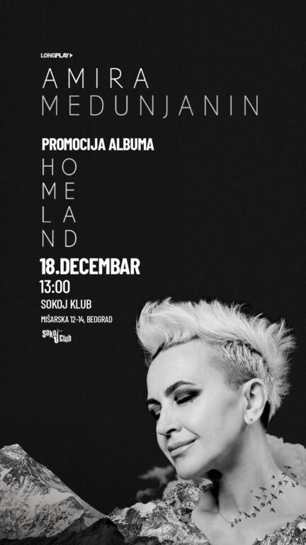 Pozivamo vas na promociju novog albuma Amire Medunjanin „Homeland“, u sredu 18. decembra (13.00) u SOKOJ klubu (Mišarska 12-14). Amira će tom prilikom i održati mini-koncert.