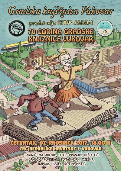 U Gradskoj knjižnici Vukovar, 7. prosinca 2017. s početkom u 18 sati održat će se promocija strip-albuma „70 godina gradske knjižnice Vukovar“. Ova velika godišnjica zahtijevala je i poseban način obilježavanja iste, a kako Gradska knjižnica Vukovar prednjači u inovativnim praksama ne treba odviše čuditi odabir forme strip-albuma kao adekvatnog medija. Strip u Hrvatskoj, pa tako i u Slavoniji odavno je etabliran kao dio kulturne scene, manji ali žilavo postojeći – prije svega zahvaljujući predanom radu i velikom talentu domaćih autora. Zbirka strip-naslova Gradske knjižnice Vukovar je odlična i čitana, no ova odluka, upustiti se u produkciju vlastitog strip-albuma je veliki presedan i odličan početak daljnje uspješne suradnje. Možda je to i nekakav logičan slijed, po obnovi knjižnice, dakle stjecanju optimalnih uvjeta za rad i zatim uspostavljanjem devet programskih ciklusa: Kulturni četvrtak, Književna slagalica, Ususret trećoj životnoj dobi, Likebook – humanitarni sajam knjiga, Ljeto u Gradskoj knjižnici Vukovar, Novinarsko – književnički susret: Grad – to ste Vi, Advent u knjižnici, STEM revolucija – Robotika i Otok poezije, dolazimo i do ovog strip-albuma. Sve je počelo ljeta 2016-e na Vukovarskom filmskom festivala i posjeta grupe autora knjižnici gdje se jedan neobavezni razgovor pretvorio u projekt kojeg ćemo imati čast predstaviti u velikom finalu unutar programa Kulturni četvrtak. Idejno, ovaj strip-album ima za svoj osnovni cilj – obilježiti 70 godina postojanja gradske knjižnice Vukovar, ali tu je i niz drugih ciljeva poput popularizacije čitanja i posuđivanja knjiga, predstavljanja velikog crtačkog umijeća naših autora (i to ne samo onih koji su ostvarili značajne uspjehe u stripu u Hrvatskoj, već i onih koji te uspjehe tek trebaju postići). Ovaj strip-album čini 12 stripova koje je crtalo 12 strip-crtača, većinom iz Slavonije, a uz to imamo i odličan generacijski i stilski presjek poimanja medija stripa kao i same tematike Vukovara, knjižnice kao ustanove, života i rada u istoj i knjiga (u segmentu knjiga treba obratiti pozornost na naslove koji se pojavljuju u stripovima jer su prilično dobra preporuka što čitati i ujedno referenca za razumijevanje motiva koji su korišteni u strip- scenarijima). Strip-album ima 78 stranica, tvrdi uvez, tiskan je na kunstdruk-mat papiru u osječkoj tiskari Graphic Shop, cijena je 120 kuna, motiv na naslovnoj stranci crtao je Domagoj Rapčak, dizajn naslovnice i korica potpisuje Marko Dješka, prijelom je radila Tatjana Ivegeš-Wilhelm, uvodnik je pisao autor ove najave (ujedno i urednik izdanja), a pogovor potpisuje ravnateljica knjižnice prof. mag. bibl. Jelena Miškić (bez čije vizije i prepoznavanja produkcijskog potencijala ekipe okupljene oko Inicijative Hrvatski autorski strip ovog projekta ne bi ni bilo). No, ono najbitnije jesu sami stripovi. Strip-album otvara Nenad Barinić, kako i dolikuje prvom crtačkom peru Vukovara, stripom „Tri prijatelja“. Nenadova uspješna 30-godišnja karijera učinila ga je poznatim širom Hrvatske, a brojne djelatnosti kojim se bavi su uvelike pridonijele općoj kulturi života u Vukovaru. Njegov strip „Tri prijatelja“ posveta je kako navodi: „ljudima koju su istinski voljeli poznavali i razjašnjavali povijest Vukovara, ostavili trag svojim djelovanjem i zemaljskim postojanjem učinili čast svima koji su ih poznavali.“. Tko su tri prijatelja kojih se Nenad s radošću sjeća pročitajte u samom stripu, a valja još naglasiti da Nenadovim stripom dominiraju prikazi vukovarskih motiva koji svoju kulminaciju imaju u vještom crtežu-rekonstrukciji Vukovarske tvrđave.