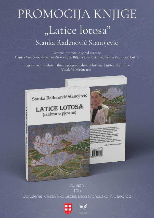 Dobro došli, na promociju zbirke pjesama „Latice lotosa“ autorice Stanke Rađenović Stanojević u UKS u četvrtak, 25.4.2024. u 19 sati.