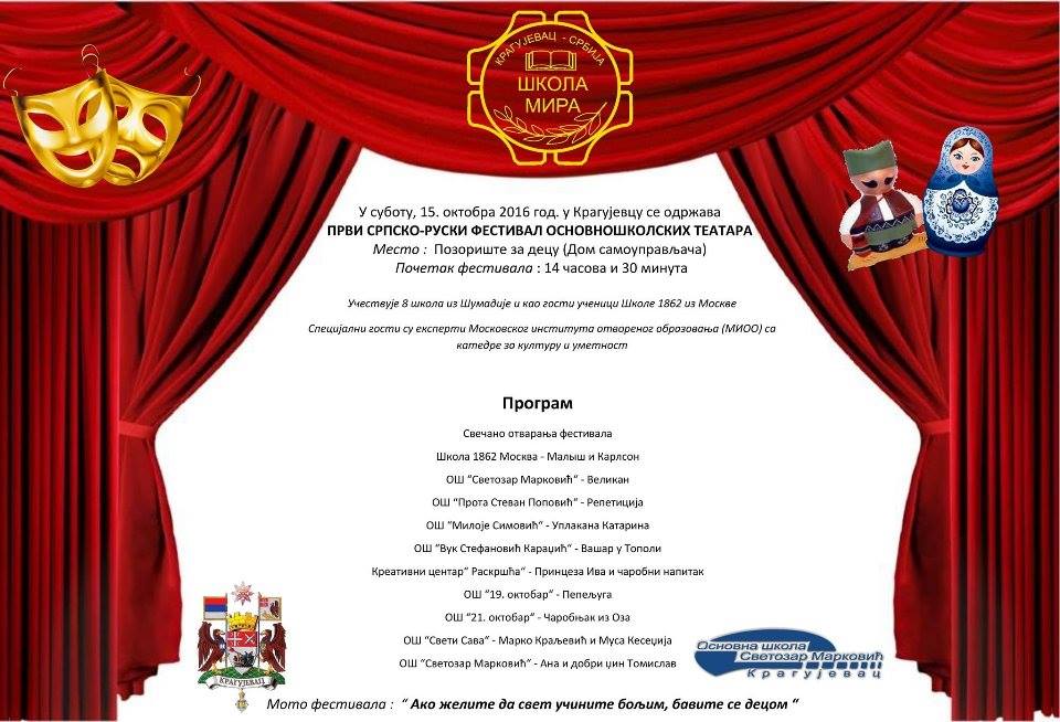 U subotu 15.10.2016. godine organizuje se Prvi srpsko-ruski festival osnovnoškolskog teatra u Dečjem pozorištu u Kragujevcu. Nastavnici sedam osnovnih škola iz Kragujevca predvođeni entuzijazmom profesora Petra Stefanovića predstaviće se svojim prestavama. U festvalu učestvuje i Kreativni centar „Raskršća“ sa lutkarskom predstavom. Gosti festivala su učenici i nastavnici Škole 1862 iz Moskve sa svojom predstavom.