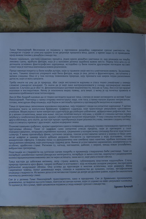Тања Николајевић нема намеру да слику подвргне неком „стилу” или тренду: њој остаје сјајна ликовна реторика са песничким атрибутима, речник који открива нови појмовник у оквиру традиционалне модерне. Ако би требало дати дати дефиницију фигурацијске основе слика са птицама онда би то било – птице величају своју слободу. Али са птицама се радује и сама сликарка која у својој подсвести трага за неким неким новим ликом своје слике. Она пушта своје слике у сложену ритмичку игру, у многогласје. Глад њеног духа за снажним визуелним ритмовима и колористичким хармонијама и јача од закона стила, идеолошких принципа и поетичких императива. Она слика силама и покретима бића, узвишеним надахнућем елементима плодног и звучног ликовног језика: један потез четком – једна целовита форма, написао је Срето Бошњак, ликовни критичар.