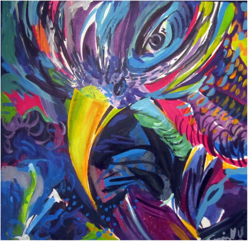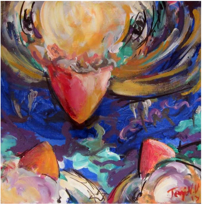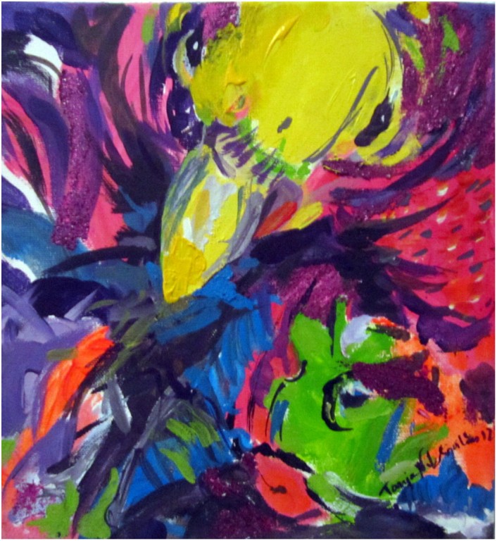 Ako bi trebalo ukratko dati definiciju figuracijske osnove slike sa pticama onda bi to bilo – ptice veličaju svoju slobodu. Ali sa pticama se i raduje i sama slikarka koja u svojoj podsvesti traga za nekim novim likom nove slike. Ona pušta svoje slike u složenu ritmičku igru, u mnogoglasje.