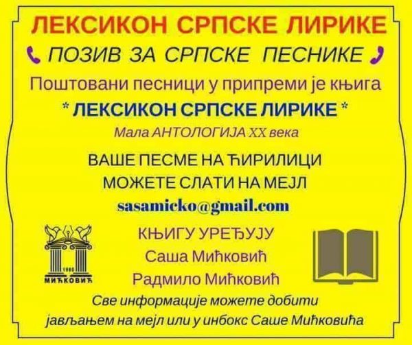 Mićković Sašahttp://sasamickovicpoezija.weebly.com/Saša Mićković je pesnik, objavio je sledeće knjige: Jastreb u oluji, Božanska Srbija, Račanski svitak, Duhovna zarenja, Špil soneta, Uspavanka za dušu. Pesme objavljuje u časopisima: Književne novine, Trag, Prolom, Svitak, Brankovina, Bdenje, Diogen, Književne vertikale, Književni pregled, Sizif, Zvezdani kolodvor, Koreni - list Srba iz rasejanja, Ljudi govore (Toronto), Bosanska vila, Srpska vila, Majdan, Naslijeđe, Sretanja, Slovoslovlje, Voštanice, Jesenjin, Riječ, Jež, Etna, Nosorog, Šipak, Avlija magazin, uvršten je u leksikon Srpski pisci u rasejanju 1914-2014 i dr. Član je Književnog kluba "Branko Ćopić" iz Beograda. Dobitnik je nagrada: Pesnička hrisovulja, Srpske duhovne akademije (2016) i Godišnja nagrada opštine Rača (2016).