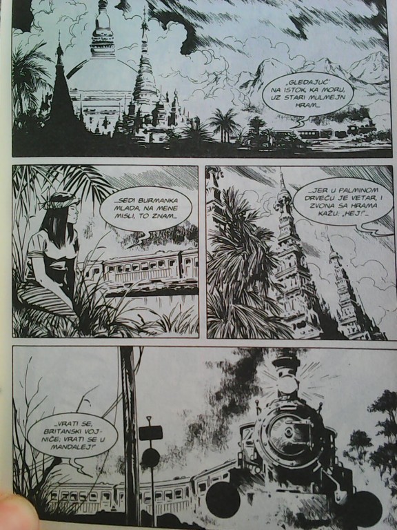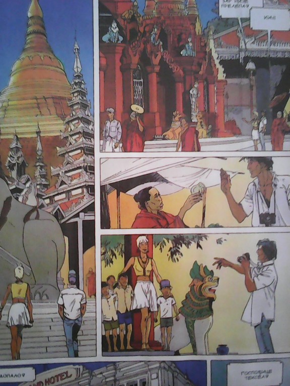 A od prijatnijih motiva, tu su i zanimljiva jela, običaji i maniri, životna filozofija uz koju i siromaštvo deluje ležernije, pa monsuni i kiše (ah, poplave!?),tigrovi i slonovi, bambusi i pirinač… nošnja, obredi i hramovi… No, pošto ovo ne bi trebalo da bude neka kulturno-istorijska analiza, a ni esej na osnovu određene priče, prilažemo još kolaž od ilustracija iz nekoliko ugl. evropskih stripova čija radnja se odvija na ti područjima. Dakle ovakve avanture su kačile i Larga Vinča (slike 3 i 4) i Mister Noa (lepo nadovezana, slika 5), naravno Tintina, pa Luna Kralja ponoći i dr. (na slici Lun simulira pripitost dok se u jednom baru u Bangkoku raspituje za prijatelja Sema, krupnog mornara, pustolova i zavodnika…)