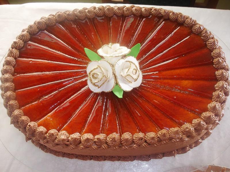 Fil: skuvajte žumanca sa 10 kašika šećera i 2-3 kašike vode u mikrotalasnoj meni je lakše i brže, a ukoliko vam je to komplikovano skuvajte ih na pari, umutite 5 belanaca u čvrst šam, umutite puter ili margarin. U skuvanim žumancima dodajte otopljenu čokoladu, u mlak fil dodajte puter ili margarin i na kraju lagano umešajte belanca. Smesa vam neće biti preterano čvrsta, ne brinite tokom hladjenja će se neverovatno stvrdnuti. Šecer glazura: otopite 200 g šećera do karamela, sipajte sok od limuna i dodajte malo margarina, i brzo prelijte preko kore koju ste ostavili za ukrašavanje. Veći oštar nož provucite kroz margarin, radite to veoma brzo i utisnite komadne parčiće po šećeru. Filujte korice i odozgo poređajte šećernu koricu. Dekorisite tortu preostalim filom ukoliko vam ostane, ili umutite šlag beli ili čokoladni.