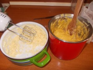1 kašika brašna. Uzeti špric za tulumbe i na podmazan i brašnom posut pleh ili aluminijumsku foliju istiskivati male štapiće. Peći oko 25 min. na 150 stepeni da ne pregori.Fil: 3 žumanceta 1 kaš. šećera i 120 gr. brašna skuvati u 5 deci mleka.