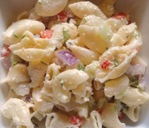 Kačkavalj, šunku, obarenu šargarepu, krastavčiće i papriku iseći na kockice, pa dodati ohlađenoj testenini.