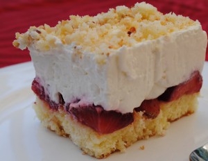 Preko žutog krema poređati 1 kg na pla isečenih jagoda pa preko jagoda ide šam: dobro umutiti 5 belanaca sa 10 kašika šećera.