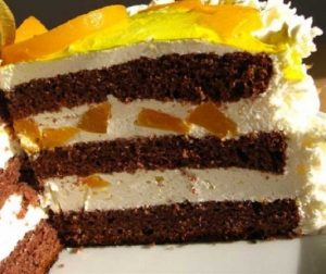 Dobro umutiti žumanca i šećer na pari. Ohladiti. Posebno umutiti margarin i šećer u prahu i pomešati sa filom. Odvojiti 100 g šlag krema, umutiti i dodati filu kao i kielu pavlaku. Sve sjediniti i podeliti na dva dela. Menaž čokoladu i belu čokoladu otopiti, svaku posebno naravno. Pa u prvi deo dodati Menaž čokoladu, a u drugi deo dodati belu čokoladu. Umutiti i preostali šlag krem. Filovati na sledeći način: Braon kora, beli fil, breskve, šlag krem, bela kora, crni fil, šlag krem, crna kora, beli fil, breskve, šlag krem, bela kora, crni fil, šlag krem.