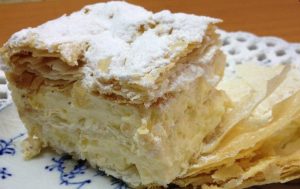 500 gr.lisnatog testa ili gotove kore za krempitu, 6 jaja, 2 vanil šećera, 20 kašika šećera, 8 kašika brašna,4 kašike gustina, 1 l.mleka i 2 kutije slatke pavlake