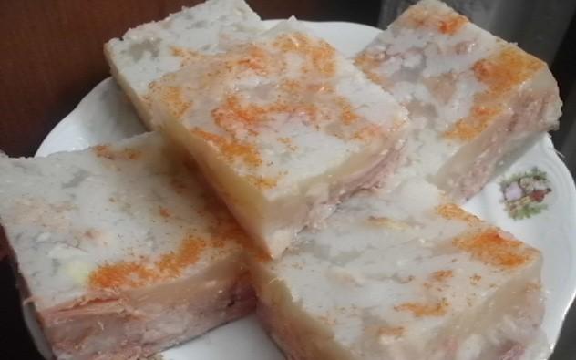 Iseckati ih. Tečnost u kome su se kuvale nogice sipati u jedna djuveč ili u modle pa u to dodati iseckane nogice. Izmešati. Posoliti još po ukusu. Dodati biber u prahu po ukusu. Seckan beli luk po ukusu i odozgo posuti sa mlevenom crvenom paprikom. Ostaviti da se stegne na hladnom.