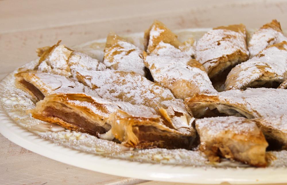 Ređati u pleh obložen papirom za pečenje. Peći na 200 C oko 25 minuta. Pečenu pitu posuti šećerom u prahu.