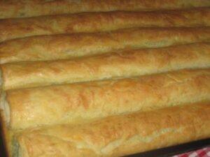 Umutiti jaja kao za tortu, dodati jogurt, ulje, brašno, prašak za pecivo, posoliti fil po ukusu. Kore podeliti na tri dela. Svaku koru premazati filom. Uviti kao štrudlu. Staviti u pleh i posuti delove susamom.