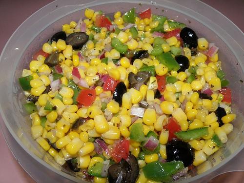 Kukuruz ako je svež obariti ako je zamrznut samo ga provući kroz toplu vodu i procediti. Papriku oprati, seći na sitne kockice. Sve sastojke sjediniti i lagano promešati.