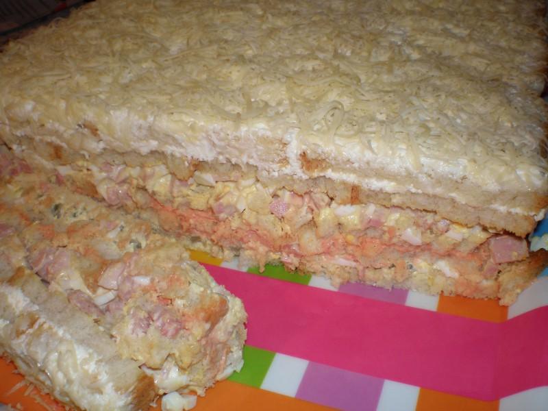 Tost redjati uzdužno, znači svaka “kora” je napravljena od četiri parčeta tosta. Prvi sloj namaže se sa pavlakom pomešanom sa sitnim sirom, poređajte preko toga šunkaricu tanko isečenu. Na šunkaricu dodati još malo sira da bi “držao” gornji sloj. Drugu koru namažite kečapom, narendati krastavčiće, preklopiti sa trećim slojem.