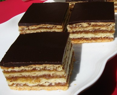 Ušpinovati 300 gr. šećera kao za slatko (malo ređe) dodati 300 gr. mlevenih oraha.Kada se prohladi ređati u pleh ovim redom. Prva kora pa nju premazati sa pekmezom od kajsija pa pola fila sa orasima. Preko toga druga kora pa pekmez pa druga polovina fila pa treća kora. Tu treću koru ničim ne treba mazati.Ona je završna. Peći u rerni .Ohlađene žerbo kocke preliti sa čokoladom i seći na kocke.