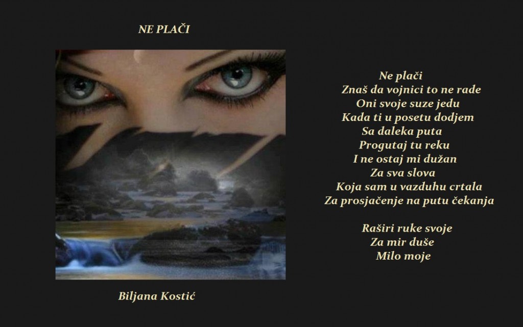 nov 10, 2016 Saljin prozor u svet poezije: Ne plači – Biljana Kostić ključne rečiBiljana KostićNe plačiSalja P.SlovenskiSaljin prozor u svet poezije FacebookTwitterEmailViberReddItWhatsAppTelegramPrintPinterestTumblrLinkedinMixVKDiggLINENaver Facebook Prethodni tekstDa li ste znali: Australija XIIISledeći tekstAdmir Džibrić: Urlik Salja P. SlovenskiŽivi u Ljubljani poeziju piše od detinjstva piše dosetke šale i aforizme. PROČITAJTE! Mesečina Lorena Galeta: Katakomba Lorena Galeta - dec 4, 2025 Mesečina Lela Milosavljević: Srce lampaško Lela Milosavljević - dec 4, 2025 Mesečina Poranio Milorad: *** Zoran Todorović - dec 4, 2025 Magazin Savet: Kako postići izgled “ mačkastih“ očiju Bojana Pudar - avg 10, 2014 Fotografija Foto album šampiona: Ljubav se nastavlja Zoran Todorović - feb 22, 2021 Magazin Žarko Ilić: Da li je ispravan svaki naš korak? Žarko Ilić - okt 14, 2018 Magazin Zamena starih dizel vozila za „euro 6“ motor, kako do subvencije Zoran Todorović - jan 30, 2023 Magazin Zdravlje i lepota: Kako izbeliti podočnjake? Ema Vitković - jan 18, 2021 Mesečina Ljiljana Skelic Vemic: Oči svoj tren traže Ljiljana Skelić Vemić - jul 25, 2019 Kultura Marko Spirić: Intervju sa prof. dr Radmilom Jankovićem, direktorom Klinike za anesteziju i intenzivnu terapiju KC Niš Marko Spirić - jun 30, 2019 Strip Od zidova do kaiševa koji život kazuju… Mišo Koprivica - mar 4, 2014 Mesečina Emir Bajrović – Riječ (Poezija) Emir Bajrović - dec 1, 2020 Zanimljivosti Električni bicikl koji prečišćava vazduh Zoran Todorović - jan 24, 2019 Mesečina Stefan Simić – Heroj teretane (Govori: Mile Vasiljević) Milinko Mile Vasiljević - nov 12, 2018 Satatatira Žena BALKANSKA Branka Vojinović Jegdić Branka Vojinović Jegdić - apr 18, 2017